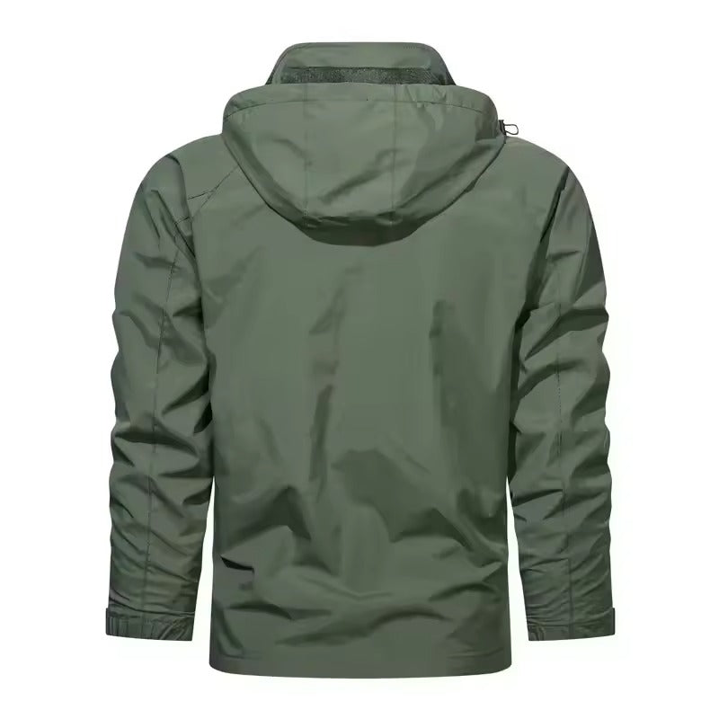 Diese Herren Sommerjacke ist mit einer fest integrierten Kapuze und einem durchgehenden Reißverschluss ausgeführt. Der Aufbau umfasst mehrere integrierte Taschen im Frontbereich. Alle Elemente sind dauerhaft angebracht und nicht abnehmbar. Die Gestaltung ist auf eine sachliche, funktionale Jackenkonfiguration für die Sommersaison ausgerichtet.
