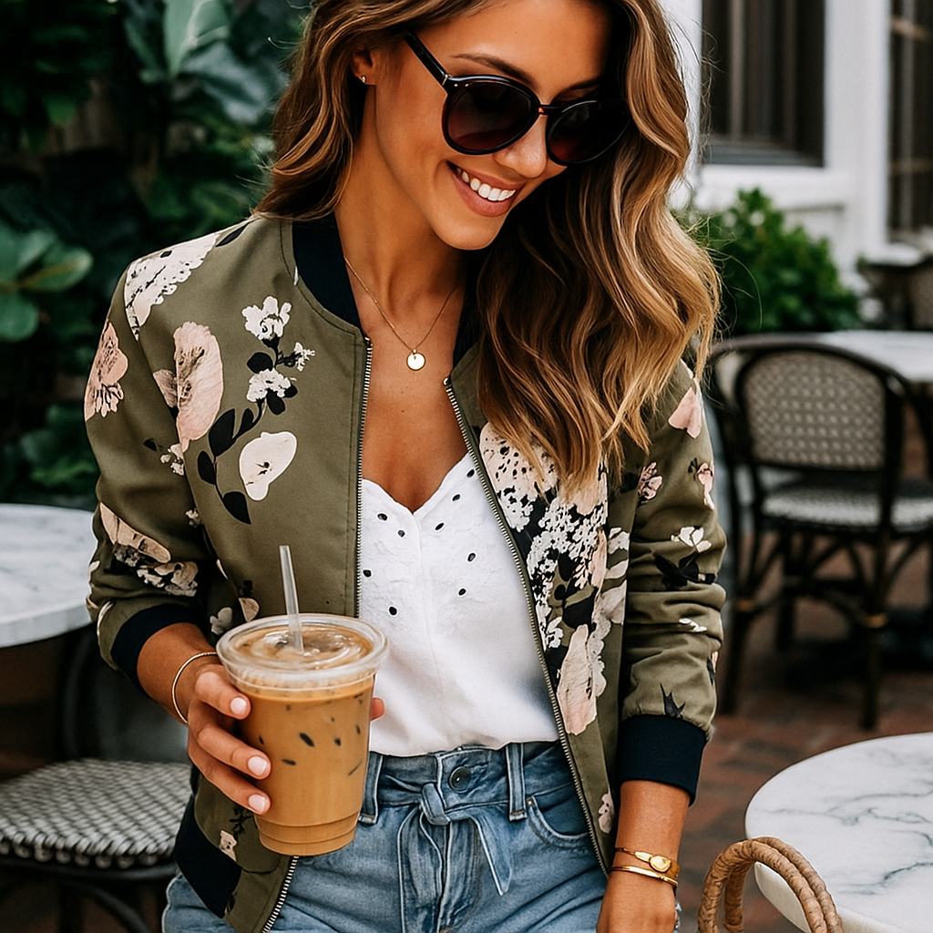 Lekka damska kurtka typu bomber z kwiatowym wzorem | Ciepła